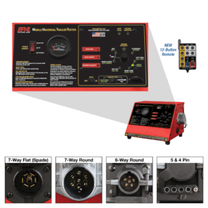 Built to facilitate a one-man testing operation, the Smart MUTT® X reduces guesswork and inspection time to prevent failures that lead to expensive road calls and citations. Designed to be used on five trailer connection types (7-way flat (spade), 7-way round, 6-way round, 5 pin and 4 pin connections), the SMART MUTT® X tests lights and electric/hydraulic brakes on commercial and light-duty trailers.